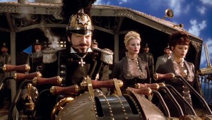 The attempt at humor was another big reason for this movie misfiring, and the “comedy” hasn’t aged any better in the ensuring twenty years. Some of the moments of humor are so misguided that they took my breath away. The jokes are generally obvious and mean-spirited. Branagh’s villain, Dr. Arliss Loveless, lost his legs in the Civil War, so every joke at his expense involves not having his legs. Get it, it’s funny because he’s handicapped. There’s one spectacular exchange where Smith and Branagh trade insults about Smith being black and Branagh being legless, and it goes on for like four exchanges (“…will keep you from being a slave to disappointment”). It’s so cringe-worthy. There’s a sequence where an angry mob literally throws a noose around Smith’s character and plans on lynching him unless his quick wits can save him. It’s a scene you would never see in a mainstream movie today, using a lynching as a comedy set piece. Who thought this was a good idea? Then there’s more than a few jokes where the sole punchline is “gay people or trans people are weird.” Kline’s character, Artemis Gordon, has a penchant for dressing like a woman in disguise, which merits Smith’s mockery of how ugly he looks. See it’s funny because he looks like a man in drag. There’s a scene related to this where Kline is bragging about his prototype fake breasts and Smith shows him how to make them feel more real, and there are two cutaway reaction shot jokes about overhearing this exchange out of context. It doesn’t make it better when Smith goes undercover as a woman to seduce Loveless. He also shoots fire from his bra. These scenes aren’t funny but they also feel uncomfortable for where people felt the humor should be targeted.