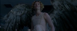 For a while there, it seems director Francis Lawrence wanted Constantine to be a companion to Wesley Snipe’s Blade character. Maybe the two of them can set up a play date and go destroy otherworldly creatures. There’s a visually striking sequence late in the film involving Constantine in a room full of demons. He’s “contaminated” the water system by placing a giant cross inside, thus holy-fying the water before he can bottle it and sell it to the masses. He holds a lighter to the sprinkler system, demons growling all around him ready for their kill, and then water sprays down across the room. “Holy water?” one female demon says in a stunned voice, watching her flesh sizzle away. Then Constantine marches through the wet room blowing away demons into splashes of ash with his comically unwieldy cross-shotgun. It’s filmed wonderfully with dark hues and is a great idea; however, it’s a bit of a rip-off of the opening sequence in the first Blade.