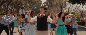 There’s a lot of drama to be mined here with the breakup territory, but the movie is also playful and funny. Director Marc Webb, he of the video music world, pokes fun at other filmic expressions of love. At one point, Tom struts down the street and becomes the center of a lively choreographed dance sequence complete with animated blue birds. At another point, during Tom’s heartbreak, the movie descends through Bergman and Fellini visual tropes. It simultaneously communicates Tom’s emotional highs and lows and satirizes the histrionic nature of his feelings. Truly, when one’s in love you couldn’t feel better, or worse, but upon retrospect you can see how silly such in-the-heat-of-the-moment proclamations can be. There’s also a scene later in the film where Tom attends a party that Summer invited him to. The screen cuts in half, and on one side we see Tom’s expectations of what will happen that night and on the other side we see what actually occurs. The visual symmetry is interesting and a great glimpse inside the mind of a hopeful romantic.