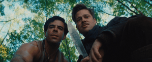 What is truly surprising is that Basterds unflinchingly looks at all the ugly aspects of war. The movie doesn’t neatly categorize the villains and the heroes. Zoller is a German sniper that killed 300 Allied troops and yet he is portrayed as grounded and romantic, a film lover able to chip away at Shoshanna?s steely reserve. To the basterds, they refuse to see past the uniform and armband; there is no difference between a Nazi and a German soldier. They will mutilate both on principal. Tarantino also gives time to examining the collateral damage of war, watching innocents gunned down in the name of duty. Shoshanna’s plot for vengeance involves the horrific deaths of scads of people whose only sin may have been being German in Paris. Operation Kino is described by Landa as a “terrorist plot” and isn’t it, really? But then Aldo disputes that a “Nazi ain’t got no humanity” and that collaborators and bystanders are just as culpable. Aldo and his basterds march through France committing what could sensibly be described as war crimes, and these are the good guys! Even with all the camp and stylized violence, there may be moments where you want to cringe and ask yourself, “Am I supposed to be enjoying this??