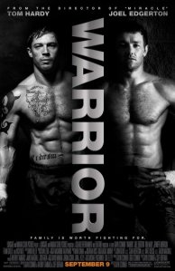 This may be a mixed martial arts (MMA) movie in appearance, but really Warrior is put together like a traditional boxing movie. Director/co-writer Gavin O’Connor (Miracle) takes a kitchen-sink approach to storytelling; just about every damn dramatic thing you can think of, short of emergency baby deliveries, is stuffed into this movie. You’ve got two brothers, one a hard luck school teacher (Joel Edgerton) trying to save the bank from taking his home (his family is broke due to his sick daughter’s medical condition), and the other (Tom Hardy) an Iraq War vet who saved lives and wants no glory, for he’s haunted by the men in his platoon who did not survive. Add a drunken father (Nick Nolte) trying to live life on the straight-and-narrow who wants to get back in his sons’ good graces, the teacher’s community rallying around him, the Marine’s comrades in service rallying around him, and some major personal issues between brothers (Hardy feels that his bro abandoned him and their sick mother), and two competing underdog tales, and my God, it’s hard not to feel beaten into submission. But damn if it isn’t effective stuff. I was tearing up at multiple points, completely sucked into the drama, riveted by the brutal, adrenaline-pumping MMA fight scenes, and pining for family reconciliation. Hardy and Edgerton flex more than their muscles on screen; each gives terse, heartbreaking, completely convincing performances as broken-down men struggling for redemption. You don’t have to no a lick about MMA to get hooked by the heavy emotional beats of the movie. Warrior is by no means a subtle movie, but it pushes all the sports genre buttons expertly, presenting a gratifying, affecting meat-and-potatoes drama that grown men are given permission to get weepy over.
