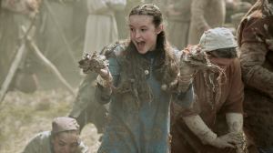 Right away, I was taken with the sprightly energy and strong personality of our narrator, who would prefer to go by Birdy, thank you very much. We open with her literally slinging mud with the neighborhood kids and laughing and wilding out, enjoying the thrills of being young. The contrast of the movie will hinge upon the distinction of what is childish and what is mature, as these youngin’s are thrust into adult roles because society says that as soon as they can menstruate, they are ready to be married off and become baby factories. Birdy is angry with her mother for continuing to try and have children, especially after the painful recuperation of burying sibling after sibling. She resents the idea of being a mother, and especially so early into a life that still feels bound by the stirrings of being a child. Girls should be allowed to be girls, she demands, and by that she means running around, talking with her friends, and absent the pressures and limitations of adulthood. She’s defiant against the larger Medieval system of valuing women for their fertility. Dunham is smart enough to frame the movie in credible terms. It’s not like Birdy, through her tenacity, is going to overthrow an entire centuries-old system of gender norms, but the story is positioned in more personal terms, in breaking through to her father to see her on her own terms rather than as a convenient investment portfolio. That’s more achievable and will be more gratifying for us because of what winning him over will mean.