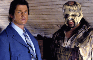 Matt (Muldoon) is a smooth playboy from the big city. He’s off to travel with his girlfriend, Dawn (Keegan Conner Tracy), to meet her parents. Dawn grew up in a very small town well off the beaten path. This requires a trip through the Blackwoods, what she calls the hard-to-see forested area when night hits. The lovebirds get a good talking to about excessive speeds by the town’s sheriff (Michael Paré), who finds Matt curiously familiar. They shack up at a seedy motel run by a seedy owner (Clint Howard). After some vigorous time between the sheets, Dawn goes off to the bathroom to freshen up. Matt is tormented by visions he cannot quite place but they involve something to do with a car accident. He wakes up to find Dawn has disappeared. On top of all this, a man with an axe breaks into the room. Matt fends him off and goes looking for what happened to his sweetheart. No one seems to believe him. Then he finds a decrepit house out in the woods. He gets knocked out and locked in the basement. Inside, Matt is put on trial for murder by a local family, who plan to become hillbilly judge and jury. And when they badger the witness, they really badger the witness.
