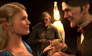 The technology has improved from the dead-eyed zombie children days of Polar Express, but it still seems like little more than less refined animation to my eyes. The movements are more fluid but the color palate is subdued into amber hues and candlelit locales. It doesn’t exactly use all the technological tools in the toolbox. It’s like a five-star chef toasting a Pop Tart: a waste of potential. I didn’t care for the skewed proportions on people either. Scrooge has a wiry frame with long spidery limbs and a triangular torso, and his character design kept reminding me of Jack Skellington. It’s too otherworldly considering nobody else comes across as a garish caricature in design form. The character designs for the three spirits are also fairly underwhelming. The Ghost of Christmas Past is a wispy flame. The Ghost of Christmas Future is nothing but a shadow. Is there a connection here? Otherwise, a shadow is pretty lame for the one ghost that can get really inventive and scary. Really, a shadow? I can do that myself without the aid of computers. And was it Carrey’s shadow to make it officially motion-capture? Because God forbid no other shadow could do or give the same performance of being draped over shapes.